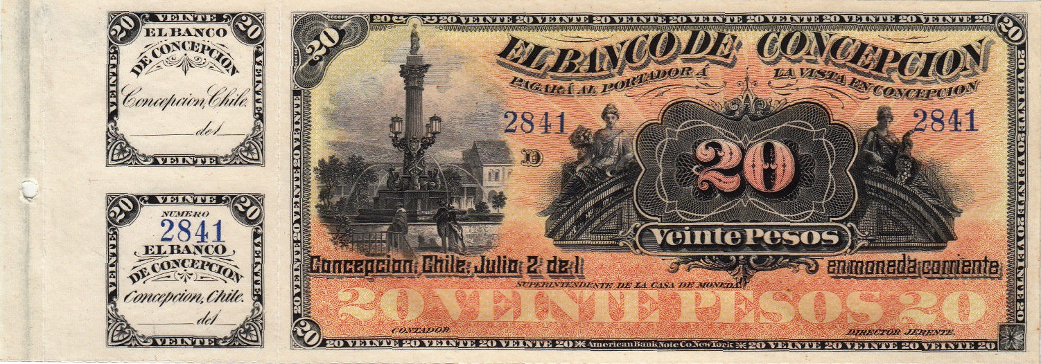 Por Decreto N° 248 del Ministerio de Hacienda de 16 de diciembre de 1871, el Superintendente de la casa de Moneda autorizará los billetes qué el Banco de Concepción emita en virtud de su aumento de capital. Boletín de las leyes i decretos del Gobierno. Libro XXXIX.